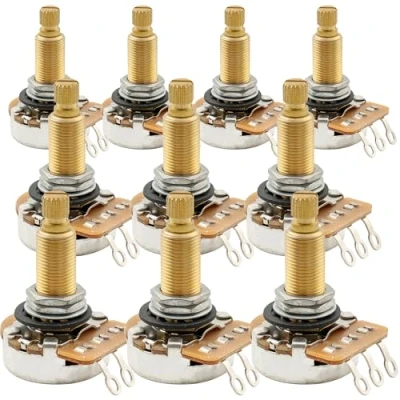 Fits some imported or Asia made electric guitars and basses, long thread for guitars with thick tops Coarse 18-spline split shaft diameter: 6mm (15/64 inch), Metric sized M9 thread, 9mm in diameter, thread height: 19mm (3/4 inch), requires 9.5mm (3/8 inch) or larger hole in the pickguard to install the pot Full brass made shaft and thread, better conductivity Linear taper, resistance: 500K, tolerance: 20%, usually used for humbuckers, remains more high-end frequencies, gives brighter tone than 250K Package includes: 10 pieces pots with mounting accessories