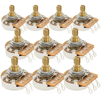 Fits most imported or Asia made electric guitars and basses Coarse 18-spline split shaft diameter: 6mm (15/64 inch), Metric sized M8 thread, 8mm in diameter, thread height: 6.5mm (1/4 inch) Full brass made shaft and thread, better conductivity Linear Taper, resistance: 500K, tolerance: 20%, usually used for humbuckers, remains more high-end frequencies, gives brighter tone than 250K Package includes: 10 pieces pots with mounting accessories