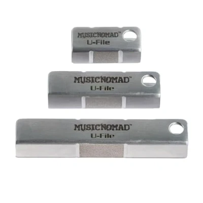 Designed by our Sonoma, CA team, the innovative U-File lowers single high guitar frets, effectively eliminating string/fret buzz. Our unique U-shaped channel design slides under the string for optimal file placement and uses a wide diamond coated file to quickly and efficiently lower and level the fret height to match adjacent frets. With strings on or off, lay across 3 frets with the high fret in the middle and file either up or down or side to side. Designed to work for all Electric Guitars, Acoustic Guitars, Banjo, Mandolin and Ukulele. Works for all Bass frets except the first 5 frets closest to the nut. Our low profile handle lets you get close to the fretboard and file with comfort and control in any direction, depending on the situation. The notches on top and arrows on the side provide the location of the diamond coated filing area. Each set includes 3 sizes: 1.25" (3.2cm) , 2" (5.1cm) and 3" (7.6cm) and a convenient storage sleeve with a hang hole. Each U-file also includes a hang hole. Precision made with .059" (1.50mm) thick stainless steel and hand lapped flat (+/-.00125"/ft) to meet tight specifications and avoid any deformation. Use with confidence, all edges deburred and/or rounded for a soft feel.