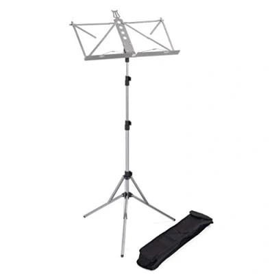 Folding music stand for everyday use Lightweight construction weighing only 0.6kg Adjustable height with easy-to-use buckle clip fasteners Made from sturdy anodized aluminium Supplied with bag for ease of carrying and storage