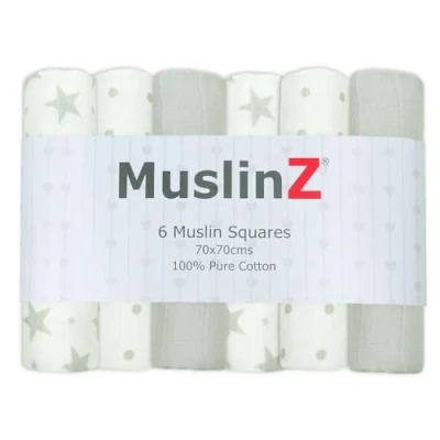 MuslinZ 6pk Baby Muslin Squares Burp Cloth Newborn Essential mulit use Soft and Absorbent 100% Cotton 70x70cm… (Grey Star)