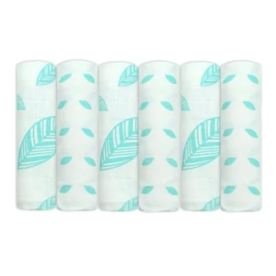MuslinZ Muslin Cloths for Baby, 6 Pack of Bamboo & Organic Cotton Mix Premium Muslins Squares 70x70cm, Large Burp Cloth Babies, Newborn Essentials Baby (Aqua Leaves)