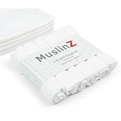 MuslinZ White 100% Cotton muslin cloths. 6 pack A baby essential for newborns. Multi use for dribbles, feeding, burping, general mopping up, as a reusable nappy and a baby comforter. So many uses ! Breathable, Absorbent, Easy to Wash and Quick to Dry. MuslinZ get softer the more you wash them, with less shrinkage and wrinkling. Still look good after many washes. MuslinZ UK brand - designed in the UK. All products are made to Oeko-Tex 100 Standard. We care about our products and how they are made. Machine washable 40°C. We recommend you wash before first use. This will increase the softness and absorbency.