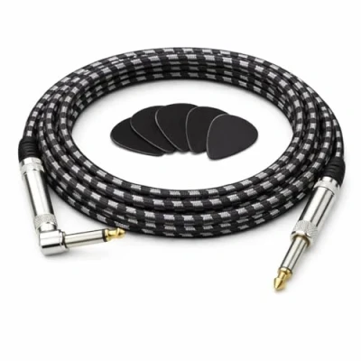 FIVE FREE PICKS: 5 Free Picks included with every MUSO PRO CABLE PROFESSIONAL RIGHT-ANGLE DESIGN Right-angle jack fits flush into your guitar to reduce strain and protect the input socket, with a straight jack for easy connection to amps and pedalboards. LOW-NOISE, CLEAN SIGNAL High-quality shielding helps minimise interference and handling noise, delivering a clear, reliable signal for practice, studio, and live use. DURABLE BRAIDED CABLE Tough braided outer jacket resists tangling and everyday wear while remaining flexible enough for comfortable use on stage or at home. CHROME CONNECTORS WITH GOLD TIPS Robust chrome connector housings with gold plated contact tips ensure a secure fit and dependable signal transfer over time. IDEAL 3 METRE LENGTH Perfect balance of freedom and control — long enough for movement without excess cable clutter around pedals or amps. BUILT BY MUSICIANS Designed by MUSO Pro for players who want dependable gear without gimmicks — practical, clean, and built to last. COMPATIBLE WITH MULTIPLE INSTRUMENTS Suitable for electric guitar, acoustic-electric, bass, keyboards, amps, and effects pedals using standard 6.35mm (¼ inch) jacks.