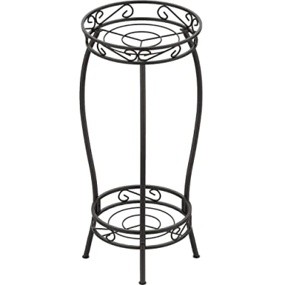 Stable & Sturdy - 2 tier metal plant stand upgraded design with 3 support points to increase the stability of the steel frame, allowing the shelf to hold up to 50 lbs Rustproof & Lightweight- Mutool metal plant stands has bronze powder-coated finish to help resist rust and corrosion.This plant pot stand is lightweight enough to easily move around your garden or home. Multifunctional - Mutool plant stands is the perfect shelf for displaying smaller plants and flowers without taking up a large amount of space.Weather-resistant for use indoors or outdoors, such as corner, entryway, garden, office, or bathroom Vintage Charm - The Metal Plant Stand features a wrought iron-inspired design, curved lines make the black round flowerpot shelf gorgeous, can blend in with variety decoration styles, which is very suitable for plant lovers. Dimensions and Installation - Two-tier tall plant stand total dimensions: 12.7in W x 12.7in D x 27.1in H, Weight: 3.8 lbs. The bottom and top frame hold pots or planters up to 10-in and 11.8-in. Easy to assemble, just Just need to tighten the screws and takes few minutes