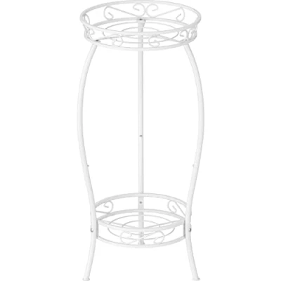 Stable & Sturdy - 2 tier metal plant stand upgraded design with 3 support points to increase the stability of the steel frame, allowing the shelf to hold up to 50 lbs Rustproof & Lightweight- Mutool metal plant stands has white powder-coated finish to help resist rust and corrosion.This plant pot stand is lightweight enough to easily move around your garden or home. Multifunctional - Mutool plant stands is the perfect shelf for displaying smaller plants and flowers without taking up a large amount of space.Weather-resistant for use indoors or outdoors, such as corner, entryway, garden, office, or bathroom Vintage Charm - The Metal Plant Stand features a wrought iron-inspired design, curved lines make the white round flowerpot shelf gorgeous, can blend in with variety decoration styles, which is very suitable for plant lovers. Dimensions and Installation - Two-tier tall plant stand total dimensions: 12.7in W x 12.7in D x 27.1in H, Weight: 3.8 lbs. The bottom and top frame hold pots or planters up to 10-in and 11.8-in. Easy to assemble, just Just need to tighten the screws and takes few minutes.