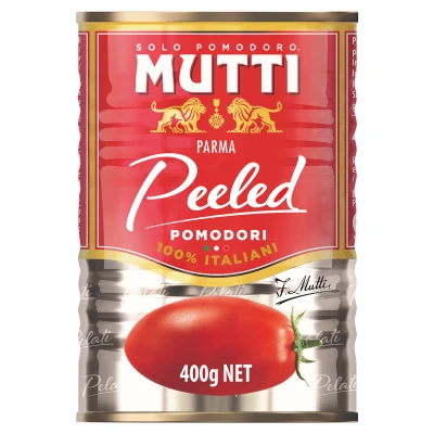 Mutti Peeled Tomatoes 400g are whole, sun-ripened Italian tomatoes, carefully peeled and packed in rich tomato juice for authentic flavour and firm texture. Perfect for sauces and cooked dishes, they are produced in Italy using sustainable practices for premium quality and taste.