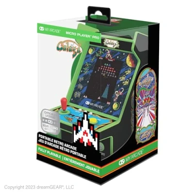 - Travel back in time with the classic Galaga game on this My Arcade micro player - It looks just like an arcade cabinet, but fits in the palm of your hand - Blast enemies into space in full colour on the 2.75" screen- It's powered by AA batteries or a USB-C cable (both sold separately)- You can use the built-in speaker with volume control to adjust it however you like