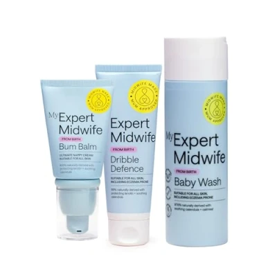MEGA MILD CLEANSING WASH - This can be used for a targeted cleanse by squeezing a small amount on to wet hands or a soft cloth. Alternatively pour directly into bath water for a full body wash before rinsing off. Our midwife developed, 97.6% naturally derived, gentle formula leaves skin feeling clean and soft. Containing soothing calendula, marshmallow, and oatmeal. This can be used from your baby’s first wash and has been developed to be gentle for your baby’s skin. TOTALLY IMMENSE DRIBBLE DEFENCE -- Apply a thin film to your baby’s chin, cheeks, neck and skin creases after each feed and reapply as often as required. Our midwife developed, 99% naturally derived, gentle creates a breathable barrier to prevent and soothe dribble rash. Containing protecting and soothing lanolin and calendula, hydrating and softening grape, apricot, and soybean oils, this is safe to use from newborn and has been developed to be gentle for your baby’s skin. NO HARM BUM BALM NAPPY CREAM: Apply a thin layer directly to a clean bottom after each nappy change or as required. This 100% naturally derived, ultra-smooth serum takes care of your babies delicate skin. Contains only 5 ingredients, including medical grade lanolin for skin protection and calendula for soothing redness and soreness. CLEAN & NATURAL INGREDIENTS: Paediatrician approved, suitable for dry, itchy and sensitive skin conditions. Mildly fragranced with gentle essentials oils. BORN IN THE UK: From My Expert Midwife who brought you the multi-award winning Pregnancy and Maternity Range including perineal spray Spritz for Bits.