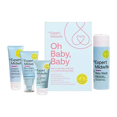 BABY's FIRST SKINCARE: Naturally derived, dermatologist tested & fragrance Free, epertly formulated to soothe, hydrate and protect from top to toe. Dermatologically tested ✔️ Fragrance-free for sensitive noses 👃 Paediatrician approved 👶 Suitable for all skin types — including eczema-prone 💙 Vegan & kind to your baby and the planet 🌍 Keep your baby’s skin clean, calm, and cared for with this gentle skincare set. BABY WASH: Our midwife-developed, 97.6% naturally derived baby wash gently cleanses while keeping your little one’s skin soft and happy. Formulated with calming calendula 🌼, soothing marshmallow 🌱, and gentle oatmeal 🌾, it’s perfect from baby’s very first wash! Pour this lightly-foaming wash into warm running bath water to gently clean from head to toe. Or apply to baby’s skin directly using a soft washcloth, before rinsing off. ALL BETTER BALM: Previously known as Skin Salve, this little tube is a one stop shop for dry skin! From cradle cap to those rough little cheeks, this balm’s got it covered. Safe to use from birth, this multitasking marvel is perfect for eczema-prone skin, cradle cap, and dry, inflamed areas that need a little extra TLC. Warm between clean fingers and gently apply to irritated or dry areas, such as eczema, cradle cap, or rough patches for targeted relief. Reapply as needed. DRIBBLE DEFENCE: Say see ya! to dribble rash with our gentle, 99% naturally derived barrier balm — made specially for your baby’s delicate skin. Packed with lanolin to protect, calendula to soothe 🌼, and castor + grapeseed oil to nourish 💧🍇, this lightweight balm helps prevent and treat sore, irritated skin caused by all that adorable drooling. BUM BALM: Bum Balm is your go-to barrier balm for every nappy change – starting from birth. It helps keep baby’s delicate skin clean, calm, and protected from irritation, soreness, and chafing. With a rich-but-light serum texture that glides on easily (no dragging on sore skin), and a one-handed dispenser perfect for wriggly or mid-meltdown moments, this balm is a true changing table hero. ALSO INCLUDED: 100% Ultra Soft Cotton Flannel and a Midwife-led Newborn Skin Masterclass. Watch our Midwife-developed webinar on caring for your baby's newborn skin before using your gorgeous baby skincare products to understand how, why and when to use them. A baby's skin is so delicate and vulnerable that we need to protect it at all costs; this includes not over washing - bathing them once or twice a week is enough and our Baby Wash won't strip away their precious natural oils or damage their microbiome (their invisible living shield!).