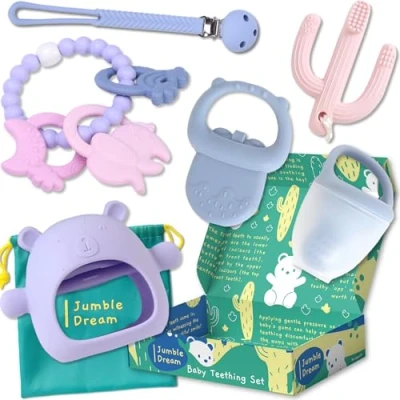 [π-π’π§-π πππππ‘π’π§π ππ¬π¬ππ§ππ’ππ₯π¬] This convenient kit combines six essential baby teething toy, each crafted to address different stages of teething discomfort. Includes a fruit feeder dummy, cooling teether, mitten, silicone bracelet, teething toothbrush, and dummy clip, which is an easy-to-use set. [πππ«π¬πππ’π₯π πππππ‘π’π§π ] This teething set is crafted to nurture oral development and engage infants from newborn to 6 months and beyond. Each baby teether soothes sore gums, encourages healthy gum massage, and eases teething discomfort, providing comforting relief at every developmental stage. [ππ¨π¦ππ¨π«ππππ₯π ππ¨ ππ¨π₯π] Each teething toy in this set is carefully designed to fit snugly in little hands, encouraging a secure grip that promotes hand-eye coordination and fine motor skills. With an easy-to-hold design, these toys help alleviate gum discomfort, a comforting sense of security. [ππππ ππ§π πππ₯π’πππ₯π] Crafted from BPA-free materials, our teethers for babies 3-6 months ensures your babyβs safety and comfort. Designed for easy cleaning, itβs dishwasher-safe. Meeting rigorous ASTM safety standards provides parents with dependable quality and peace of mind for their little oneβs well-being. [πππππ₯ ππ’ππ ππ¨π« ππ§π² πππππ¬π’π¨π§] Beautifully packaged with a charming baby-inspired design, these baby teethers 0-6 months is an ideal choice for Christmas, birthdays, or baby showers. Its portable design makes it travel-friendly, fitting easily into prams, and pushchairs for on-the-go comfort and convenience.