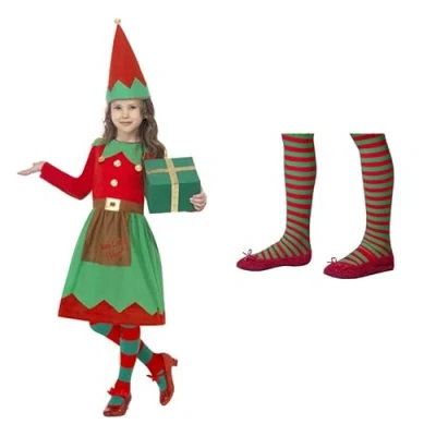 Turn your little girl into one of Santa's little helpers this Christmas with our fun and festive elf fancy dress costume This costume includes a cute red and green dress with an attached belt. Also included are the tall red elf's hat and green and red tights This costume is available in 3 sizes small ages 4-6 years, medium ages 7-9 years and large ages 10-12 years Our girl's Christmas fancy dress is great for parties and events, choirs or plays, Manufacturer: My Illusions