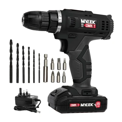 LI-ION POWER: The Mylek Black 18V/20V Lithium-Ion Cordless Drill Set is supplied with a powerful 1500MAH Li-ion battery and UK Charger which peaks at 20V from charge for that extra first use of power before stabilising to its normal 18V. No memory effect battery meaning your battery will always charge to its optimum power. Also with advanced no self-discharge which means the battery will always hold its charge when not in use or in storage. FEATURE PACKED: The Mylek Cordless Drill is equipped with a variable control trigger which can be controlled up to a no load speed of 650rpm and 15Nm in power. Forward and reverse switch that enables you to quickly switch between forward for drilling/screwing and reverse for removing screws. 18 + 1 torque selection to giving you greater control. Powerful LED work-light located perfectly to allow you to work in hard to see areas. COMFORT IN MIND: The Mylek Cordless Drill is designed with comfort in mind. Built in soft grip for comfort use, 0.8 - 10mm quick change keyless quick change chuck, only 1.0 Kg in weight, Anti Shock body protection moulding to protect the drill if dropped. All these great features help to reduce fatigue when using for extended period of time on those time consuming tasks. FLEXIBLE CONTROL: The Mylek Cordless Drill is balanced to offer you perfect control for the task in hand, with its 18 + 1 available torque selections giving you perfect control for materials like wood, plastic, metal and a variety of other materials. The drill driver has a max drilling capacity for regular materials such as wood of 20mm and of steel, 8mm. ADDED EXTRAS & 2 YEAR WARRANTY: The Mylek Cordless Drill Includes a 13 piece kit that contains 1 x magnet bit holder, 6 x drill bits, 2 x Pozi-drive, 2 x Phillips and 2 x slotted screwdriver attachments., Weight: 2.645547144 Pounds, Manufacturer: MYLEK