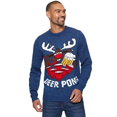 mymixtrendz Mens Knitted Xmas Rudolf Reindeer Snowflake Festive Deer Bambi Christmas Jumper (M, Pong Navy)