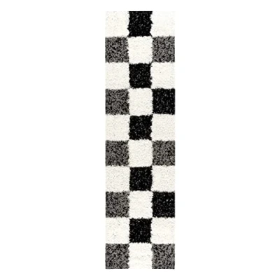 Mynes Home Deep Pile Shaggy Rug Checked Grey 70 x 250 cm/Easy Care Long Living Room Bridge