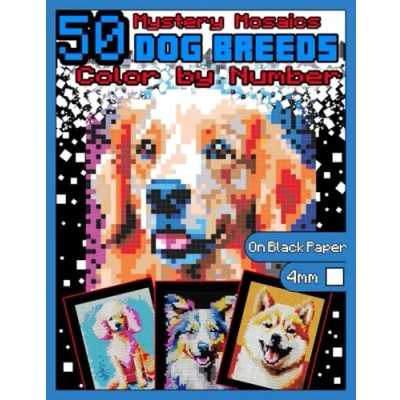 Mystery Mosaics Color by Number: 50 Dog Breeds: Pixel Art Coloring Book with Dazzling Hidden Breeds, Quest on Black Paper, Extreme ... 2 (Mystery Number Animals)