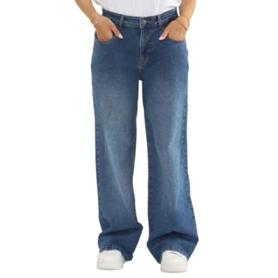 MYT Womens Wide Leg Jeans Ladies Baggy Loose High Waisted Stretch Denim Pants Mid Stonewash Blue 10 Long