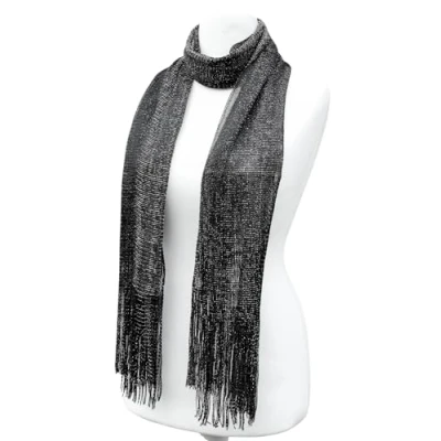 Black and silver sparkly lurex long scarf mesh shawl stole with matching tassels Lurex scarf measure approx : Length: 200cm (78 inches), Width: 71 cm (28 inches) Shiny, lurex mesh scarf in black with silver lurex featuring open weave design and tassels This mesh net lurex scarf Ideal to accessorise your day or evening wear,or just gift