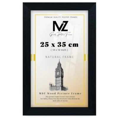 Professional Presentation: MZ Goods Frames Crafted with Solid MDF Wood and a timeless design, our poster frame effortlessly complements any decor style, be it contemporary, minimalist, or classic.Built to last, our frames are made from high-quality materials that ensure durability and long-lasting protection for your cherished posters. Size: Specifically designed for 25x35cm, our frames provide a perfect fit without compromising on style or quality. Ideal for Home, Office, or Retail: Whether it’s for your home gallery, office space, or retail store, our frames are perfect for creating captivating displays. Versatile Display Options: Whether you hang it vertically or horizontally, our frames offer versatile display options, allowing you to showcase your creativity exactly how you envision it. The crystal-clear acrylic front panel not only protects your posters from dust and damage but also enhances the visual appeal, making your artwork stand out. Great Gift Idea: Surprise friends and loved ones with a thoughtful gift that adds a touch of sophistication to their living space. Our 25x35cm Black Poster Frame is perfect for birthdays, weddings, or housewarming occasions. Protective Packaging: Your frame will arrive in protective packaging to ensure it reaches you in perfect condition, ready to display your favorite pieces.