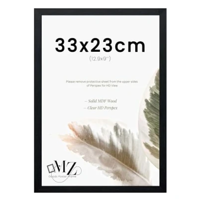 SUPERIOR MATERIAL: MZ Goods Large Photo Poster Certificate Frame is crafted from sturdy solid Eton wood, ensuring durability and long-term use. It features high-definition styrene, offering a clearer view while preserving the life of your photos with superior durability. VERTICAL & HORIZONTAL HANG: Each frame is equipped with both hanging hardware and an easel back, allowing for versatile display options. You can easily hang the frame in either portrait or landscape orientation. GENERAL FRAME: MZ Goods With its elegant design and exquisite craftsmanship, this stylish and practical photo frame is an excellent addition to any room, complementing various decor styles. GIFT BRINGS HAPPINESS: This frame 33x23cm not only showcases your artworks beautifully in any room at home or office but also makes for a heartfelt gift for friends and family. SAFE PACKAGING: MZ Goods frame is packaged using exclusive proprietary methods to ensure the safe delivery of fragile and glass items. A protective film is applied to the styrene during manufacturing to keep it dust, mark, and scratch-free. Once the film is removed, the styrene will be in pristine condition, ready for use and display.