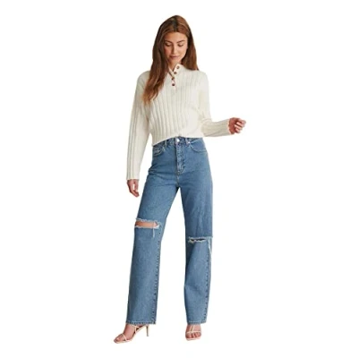 NA KD Women's Destroyed Straight Denim Jeans, Largeight Blue, 16 UK
