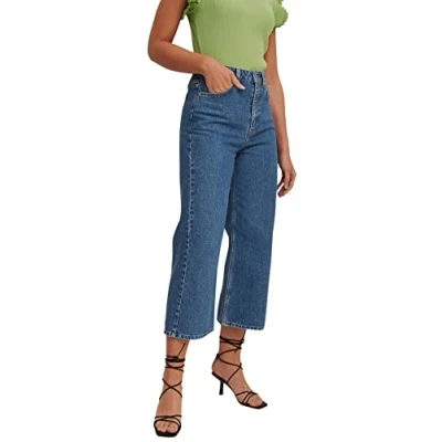 NA KD Women's High Waist Cropped Jeans, Mid Blue, 14 UK