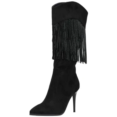 Soft imitation suede fringe with rhinestones Side zip Pointed toe cap High stiletto heel