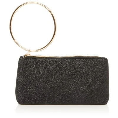 Glittery evening bag Rectangular design Large ring as a handle Textile inner lining Interior with zip