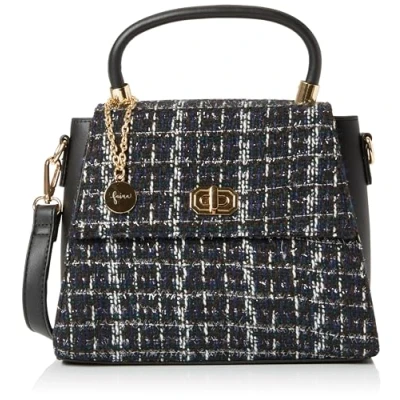 Elegant handbag Flap over with bouclé fabric Short handle Zip plus snap closure Chain with logo plate