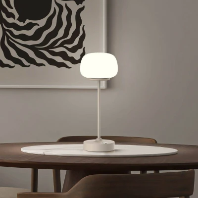 Pina LED table lamp with rechargeable battery and touch dimmer The Pina LED table lamp with rechargeable battery is a mobile additional light source that enriches living rooms and lounges. Its coloured metal frame supports a round lampshade made of frosted glass, which houses a warm white LED light source. Its light output can be regulated using the touch dimmer on the base. The previously selected brightness is available again after switching on again (memory function) - Charging time: 4 h - Lighting duration per charge: 5 h - Charging input: USB-C