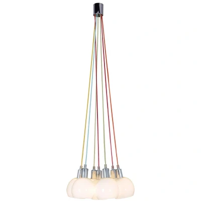 Lights.coFresh Rainbow Bowl pendant lamp with white shadesThe Rainbow Bowl pendant lamp comes in a fresh, casual design. Its seven white glass shades provide a powerful light when the E14 bulb is chosen accordingly. Colourful cables serve as holder and supply line. Shiny metal is used for the support, bundle ring and socket. The lively appearance of the Rainbow Bowl hanging lamp contributes to the ambience of lively and modern living and dining rooms.