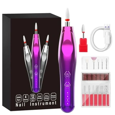 [Newest Electric Nail Files] New design with ergonomic handle, mini size. Standard USB interface is ideal for all USB socket. The electric nail drill can be used for manicures, pedicures, polishing, shaping, grinding cuticles, removing acrylic/gel nails, or for nail beauty. Perfect for both natural and acrylic nails and make it easy to treat your nails at home or salon! [Powerful but Quiet & Low Vibration] Using high-quality aluminum body and new upgraded motor, Nail file can work with low noise, low vibration and low temperature for better use. Easily removes varnish painlessly without damaging the nail. [4 Modes Adjustable Speed & Reverse Direction] Electric nail drill is designed, which makes this electric nail file easier and safer to polish your nails. The two-way rotation is very practical and ideal for left-handed, nail masters or beginners for manicure treatments. Enjoy Professional Nail Care at Home! [LED Screen/Light & USB] The display screen can display power indicator light, intensity indicator light, and LED prompt light. the LED auxiliary light can provide good lighting. The electric nail files is fast charge once for about 500 times use , Come with USB cable (Adapter Not Included), applicable to a variety of charging equipment. [Perfect Gift] This Manicure Pedicure Set is perfect Christmas, Valentine's Day, Any commemorative day gifts, for your girl friends, wife, mother or sister, who can enjoy the fun of nail art anytime and anywhere. And also great for nail masters or beginners to file or sand false nails, simple and practical to use.