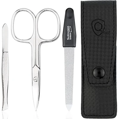 ✔ OUTSTANDING QUALITY: The nail kit includes a premium sapphire nail file from Solingen, Germany. All other pieces of the manicure set are made of strong polished nickel-plated steel. ✔ FITS IN THE HANDBAG: The manicure set convinces with its small size and fits in every handbag. So you always have your nail scissors, files and tweezer with you, at home, at work or during travel. ✔ PERFECT TRAVEL COMPANION: The manicure set has all the needed tools for on the go - its small compact size allows it to fit in any bag or compartment, making it one of your travelling essentials. ✔ PERFECT GIFT IDEA: A useful present is always greatly appreciated. This is the perfect example of one: Young or old. Christmas, birthdays and other holidays. This set is the perfect gift. ✔ PROTECTIVE IMITATION LEATHER CASE: Keep your grooming kit tools clean with the small and sturdy imitation leather case and an elegant robust design, to keep the set compact.
