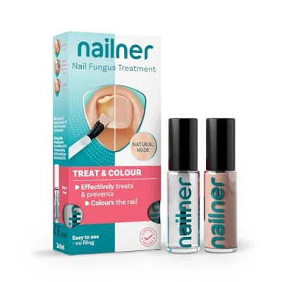 DUO PACK TO TREAT, COVER & PREVENT FUNGAL NAIL INFECTIONS: Our Treat & Colour Fungal Nail Treatment kit contains 1x Nailner Fungal Nail Treatment Brush 5 ml to treat nail infection and 1x Nailner Breathable Nail Polish in Nude Pink 5 ml to camouflage discoloured nails. HOW IT WORKS: The formula treats nail fungus by saturating the keratin layer of the nail and lowering the pH of the infected nail, creating an unfavourable environment for the fungal infection. It treats, brightens and conditions the nail, as well as helping to prevent future infection. The brush treatment contains enough product for approximately 300 applications to keep your toenails moisturised and looking healthy and bright all year round. FIGHTS NAIL FUNGUS AT THE SOURCE: Unlike many competitors, our Fungal Nail Treatment Brush has high penetration power, meaning the formula is ideal for targeting and fighting nail fungus at its source. The formulation contains a moisturising ingredient to help condition the nail while treating the infection. BREATHABLE NAIL POLISH: The breathable formula is a healthy alternative to standard nail polishes. It allows molecules of oxygen to pass through the polish and down to the nail and nail bed. It effectively conceals damaged, discoloured and dry nails, especially those affected by fungal nail infections. The formula can be used on infected or healthy nails, as it also helps prevent infection. HOW TO USE: This revolutionary new technology allows the nail fungal treatment to work alongside a breathable nail polish. The Fungal Nail Treatment Brush actively treats the nail infection while also preventing the spread of nail fungus, the Breathable Nail Polish is then used to cover the discoloured nail with a natural-looking varnish for fuller coverage and healthy looking nails.