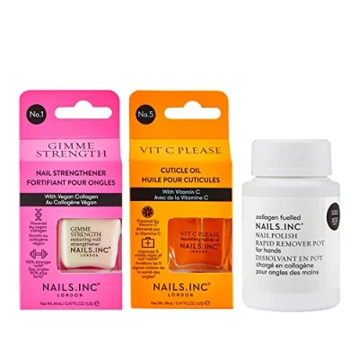 Complete nail care in one set – this 3-piece treatment kit includes a collagen-fueled remover pot, nourishing cuticle oil with Vitamin C, and a vegan collagen nail strengthener to restore and revive nails. Salon-worthy results at home – Gimme Strength restores brittle nails while Vit C Please cuticle oil deeply hydrates and smooths cuticles with antioxidant-rich Vitamin C. Collagen-Infused for Nail Health: Enriched with collagen, this remover not only removes nail polish but also helps to strengthen nails, preventing breakage and encouraging healthy nail growth. Coconut Scented & Travel-Friendly: Enjoy the refreshing coconut scent while removing polish, perfect for on-the-go use with its compact, travel-friendly design. Powered by skincare-grade ingredients – Formulated with vegan collagen and Vitamin C to visibly improve nail strength, smoothness, and overall nail health. Vegan & Cruelty Free - All Nails.INC products are vegan and cruelty-free, designed for conscious beauty lovers. We believe in beauty with a conscience, ensuring that all our products are 100% vegan, never tested on animals, and crafted with care for both you and the planet