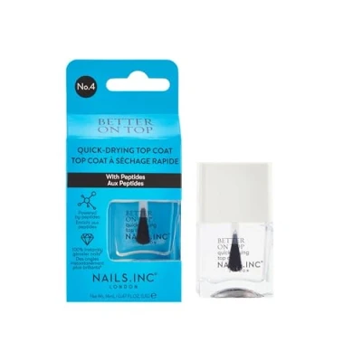 Nails.INC Better On Top Quick Drying Top Coat, Dries in 45 Seconds, Enriched with Peptides to Hydrate Nails, Cruelty Free, Vegan, (14ml) Quick-Drying Top Coat: Achieve touch-dry nails in just 45 seconds with this fast-acting top coat, perfect for a quick and flawless finish to any manicure or pedicure. Enriched with Peptides & Blueberry Extract: This peptide-powered formula is enriched with blueberry extract, designed to hydrate and nourish nails, leaving them healthier and stronger with each use. Glassy, High Shine Finish: Lock in your nail color and add an instant, high-gloss finish for that professional, salon-quality look with 100% instantly glossier nails. Strengthening & Hydrating: Formulated to nourish and hydrate, this top coat strengthens nails while creating a protective barrier, preventing chips and promoting long-lasting nail color.