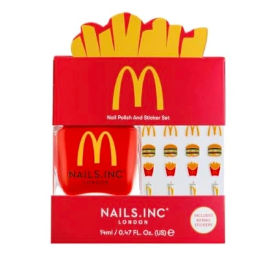 Your Order Is Up - This is the official Nails.INC x McDonald’s collaboration. Inspired by an unmissable side to any McD’s order: the fries! Inspired by an unmissable side to any McD’s order: the fries! Top your McDonald’s mani with burgers, fries or even the signature golden arches Fries Before Guys - This set includes 8- nail stickers inspired by fast food. From burgers to fries, we have you covered. Use to perfect your mani and add a cute design Functional + Fun Bottle Design – Patented non-drip brush, designed to mimic your cuticle, is wide enough to fill your nail with the perfect amount of polish every time. Cap is a mani station to create a sturdy surface to paint your nails on-the-go or travelling Clean Beauty + 21 Free – We are proud to be the leading clean beauty nail polish brand on the market by removing adverse ingredients and harsh chemicals. Our nail polish is vegan and cruelty free. We are free of phthalates, parabens, gluten, and much more Nails Inc London - Is a female-founded innovation obsessed brand, tapping into TikTok generated trends and other social media must haves. We offer a range of luxury nail polish and accessories, perfect for women and girls looking for their perfect mani or pedi