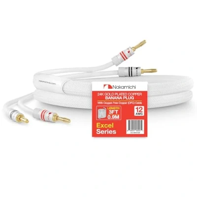 Nakamichi Excel Series 24k Gold Plated Banana Plug with (3 Feet) 12AWG Speaker Cable Wire 99.9% Oxygen Free Copper (OFC) Heavy Duty Braided for Amplifier Hi Fi Home Theatre White (3ft/0.9m)