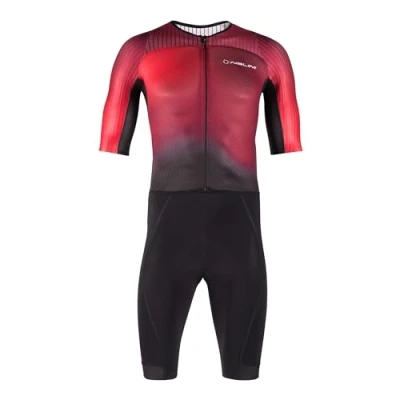 Bodysuit with striped structure of the High Speed fabric on the upper part with aerodynamic properties Mesh front bodice for greater ventilation Shuttle fabric with compressive and muscle support properties Seamless sleeve bottom secured with elastic heat sealing 3 rear pockets and reflective details