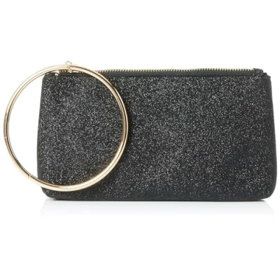 Glittery evening bag Rectangular design Large ring as a handle Textile inner lining Interior with zip