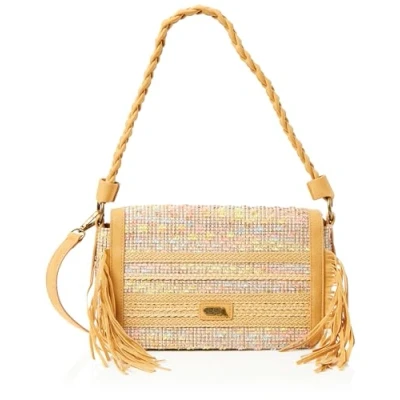 Bag with faux leather Braided in raffia look With rope fringes Flap with magnetic closure Long adjustable carrying strap