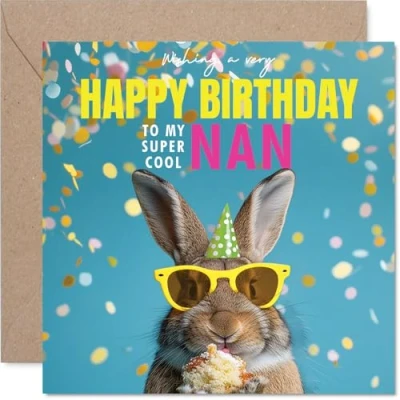 MAKE YOUR NAN SMILE WITH THIS UNIQUE BIRTHDAY CARD: This exceptional quality Nan birthday card for her shows the design 'Wishing a very Happy Birthday to my super cool Nan'. If you are looking for a beautiful birthday card Nan for her, then then this happy birthday Nan card is bound to make her smile. Not just a birthday card for Nan this could also be a birthday gifts for Nan, Nanny or Grandmother. WHAT DO YOU GET: The cards are printed on both sides with the inside print saying 'Have an Amazing Day' and ample space for your own personal message. The unique fun design is printed on a specially sourced and environmentally responsible board. At 360 microns thick the natural white one-sided gloss board has a quality look and feel. Supplied with a coloured gummed envelope to complement the design and ready to be sealed and sent in the post. NO INK SMUDGES: There is nothing worse than writing inside a card to find that the shiny surface makes the ink smudge. This is why we use a high quality one sided coated board. The uncoated side will absorb more of the ink from your pen to make smudging a thing of the past. Nan birthday cards, Nan birthday cards from Grandson. SIZES: Greeting Card = 145mm x 145mm, Envelope = 155mm x 155mm, Card Thickness = 360 micron. Happy birthday Nan, Nans birthday card, Nan cards birthday, birthday card Nan, happy birthday Nan card, Nan gifts from Grandson. MADE AND QUALITY CHECKED IN THE UK: We print and manufacture all our products right here in the UK so you can be sure of a fast turnaround and a product that is expertly made. Using environmentally responsible premium board our card is conscious of the responsible management of the world's forests - happy birthday card Nan, Nan birthday cards.