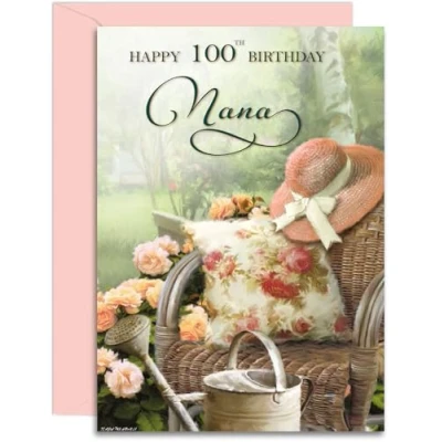 NANA 100TH BIRTHDAY CARD ⭐ Lazy Day Garden Design ⭐ Click the second image for the text inside the card. EXTRA THICK CARDSTOCK ⭐ 330gsm triple coated cardstock with a lovely matt inside surface for ease of writing SIZE ⭐This birthday card measure 148 x 210mm (A5 Size) and comes with a 162 x 229mm yellow envelope UK MANUFACTURED ⭐ A small family business. Professionally printed in our Hampshire factory ECO FRIENDLY ⭐ Our factory runs on 100% renewable energy. Our cardstock is sustainably sourced. Both the card and envelope are fully recyclable.