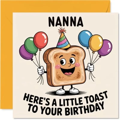 MAKE YOUR NANA SMILE WITH THIS UNIQUE BIRTHDAY CARD: This exceptional quality Nana birthday card shows the design 'Nanna Heres a Little Toast to your Birthday'. If you are looking for an awesome birthday card for Nana, then then this happy birthday Nana card is bound to make them smile. Not just a birthday card for Nana this could also be a birthday gifts for Nana, Nanny or Nan. WHAT DO YOU GET: The card is printed on one side and BLANK ON THE INSIDE to allow you to write your very own message. The unique fun design is printed on a specially sourced and environmentally responsible board. At 360 microns thick the natural white one-sided gloss board has a quality look and feel. Supplied with a coloured gummed envelope to complement the design and ready to be sealed and sent in the post. Great Nana birthday cards, Nanny birthday card. NO INK SMUDGES: There is nothing worse than writing inside a card to find that the shiny surface makes the ink smudge. This is why we use a high quality one sided coated board. The uncoated side will absorb more of the ink from your pen to make smudging a thing of the past. Nana birthday cards, Nana birthday cards from Grandson. SIZES: Greeting Card = 145mm x 145mm, Envelope = 155mm x 155mm, Card Thickness = 360 micron. Happy birthday Nana, Nanas birthday card, Nana cards birthday, birthday card Nana, happy birthday Nana card, Nana gifts from Grandson. MADE AND QUALITY CHECKED IN THE UK: We print and manufacture all our products right here in the UK so you can be sure of a fast turnaround and a product that is expertly made. Using environmentally responsible premium board our card is conscious of the responsible management of the world's forests - happy birthday card Nana, Nana birthday cards.