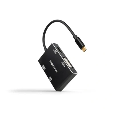 [NANOCABLE Converter USB-C Male to HDMI, DVI, VGA and Female DisplayPort]: With this converter, you can connect any screen to your laptop with USB-C input. The adapter provides all the connection options for screens currently available on the market. You can simultaneously use the HDMI and VGA ports or DisplayPort and DVI ports. All 4 ports cannot be used at the same time. PLUG AND PLAY: Plug and play technology allows easy and automatic installation without additional drivers or manual configurations. Just plug in and enjoy: the converter automatically detects connected devices and makes it easy to customize any screen to your USB-C laptop. Video resolution 4K and VGA 1080: The HDMI and DisplayPort ports support a maximum resolution of 4K at 60Hz. The DVI port allows a maximum resolution of 4K at 30Hz. Plus, the VGA port supports a maximum resolution of 1920x1080 at 60Hz, which ensures clear picture quality when connecting the device to VGA monitors or projectors. Comprehensive compatibility: this converter is compatible with Android 10.0 or higher, iPad Pro (3rd generation) or higher, Google Chromebook, MacOS 10.15.7 or higher and Windows 8 or higher. In addition, it is compatible with SST/MST mode, USB-C DisplayPort All Mode, and Thunderbolt 3 port. It complies with HDCP1.3 regulation for the safe transmission of protected content. POLICY AND OPERATION TESTS: Manufactured to RoHS Hazardous Substance Restriction Guidelines, this converter has undergone a comprehensive 100% functional test to ensure reliable and trouble-free performance. With a compact, 10cm black design, this converter is the ideal solution for users who need different connection options.