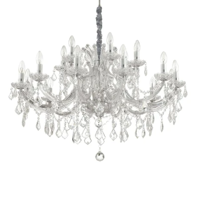 This extravagant fitting consists of a metal frame, which is available in a chrome or gold finish. The fitting is decorated with a combination of blown glass and crystal elements. The range offers a choice of different sized fittings; an eight light, a twelve light and eighteen light version. The fittings are designed in candelabra styles, where the lights are arranged in a round fashion to allow the light to spread in all directions. Velvet chain covers complete the look perfectly. Class one.