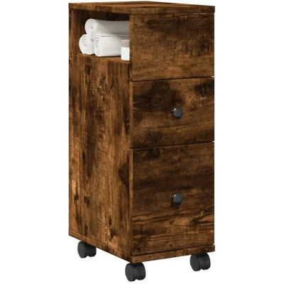 ManoManoGeneral description This classic, narrow bathroom cabinet is a decorative and practical addition to your home. It provides ample storage space to keep your daily essentials organized and protected from dust and dirt. The cabinet features four swivel wheels for easy mobility, with two of them being lockable for added stability. Technical specifications Colour: Smoked oak Material: Engineered wood Overall dimensions: 23 x 33 x 65 cm (W x D x H) Drawer dimensions: 14 x 23.5 x 9 cm (W x D x H) Top drawer box dimensions: 23 x 30 x 11.5 cm (W x D x H) Number of drawers: 2 Number of wheels: 4 (2 with brakes) Loading capacity per shelf: 15-20 kg Overall loading capacity: 60 kg Assembly required: Yes Usage This slim bathroom cabinet can be used as a storage cabinet or drawer cabinet in various settings, including the bathroom, kitchen, or living room, depending on your needs. Other information