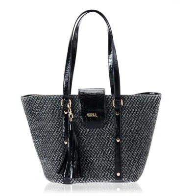 Shopper in raffia look Flap with magnetic closure Crocodile effect handle and flap Textile inner lining with leo print Interior with side pocket