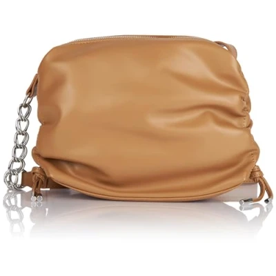 faux leather handbag Side drawstrings Long shoulder strap with chain detail Inner side made of textile
