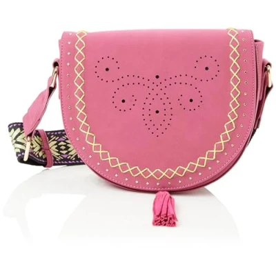 Saddle bag made of imitation leather Decorative stitching on the flap Die cut hole design Long adjustable carrying strap Flap with magnetic closure